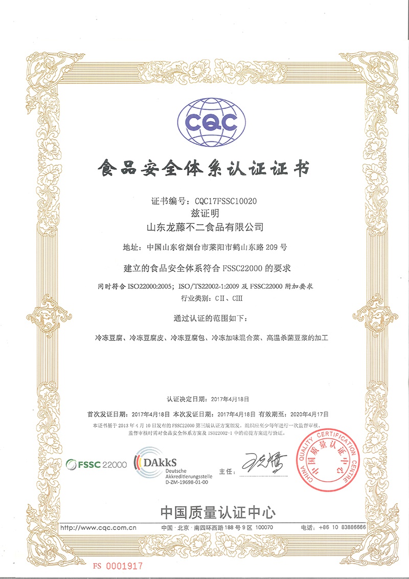 日前,山東龍藤不二食品有限公司獲得由中國質量認證中心頒發的《食品安全體系認證證書》。這一證書的頒發,意味著龍藤不二公司的食品安全管理水平正式與國際高標準的食品安全管理水平接軌。